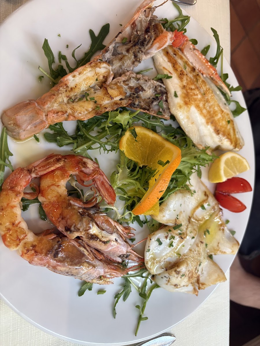 Last meal in Italy before returning home and absolutely loved the food here at Ristorante Capogrossi. My girlfriend and I shared some of their house white wine and I ordered the fried chicken with fries while she ordered the swordfish with vegetables. Both were delicious and my girlfriend loved the swordfish. It was light but flavorful, with grilled vegetables and a nice sear on the meat. Really a 10/10 dish! I got some lemon sorbet for dessert and she got Tiramisù both were delicious. The oyster appetizer was fresh and delicious as well. Would recommend this place for a delicious quiet meal with a nice surround area. Really a lovely place to dine.
